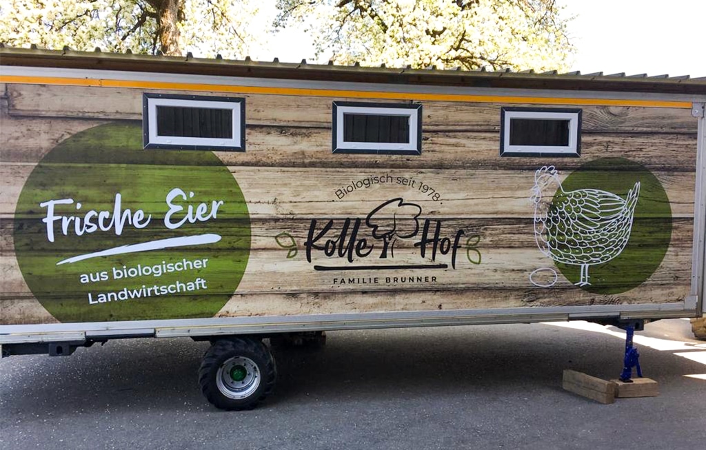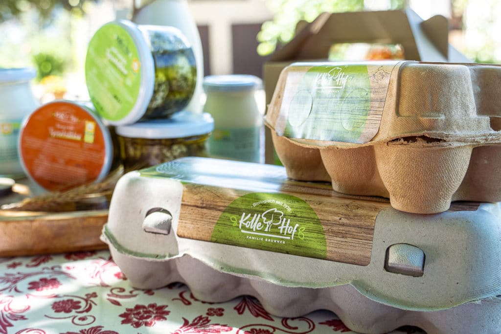 Normalerweise heißt es ja glückliche Tiere – glückliche Kunden. Wir haben diesmal den Spieß umgedreht, denn sind unsere Kunden glücklich, sind es ihre Tiere auch. Die Familie Brunner vom Kolle Hof hat sich einer Rundumerneuerung unterzogen und wir durften Sie dabei unterstützen. Zuerst musste ein Logo her, welches frisch und freundlich wirkt. Die lockere Schrift, in Kombination mit dem Baum, strahlt vor allem die Verbundenheit zur Natur aus. Ausgehend davon, haben wir noch Dankeskarten & kleine Kärtchen für die Milchflaschen, sowie Beklebungen für die Eierschachteln und den Bauernladen erstellt. Wer uns kennt weiß, dass wir Dinge gerne etwas anders machen. Deshalb haben wir uns auch hier etwas Besonderes einfallen lassen- Hanna das Huhn. Sie ist der heimliche Star vom Kolle Hof und lacht ab sofort von allen Eierschachteln. Insgesamt präsentiert sich der Kolle Hof nun in einem neuen, modernen und vor allem einheitlichen Design.