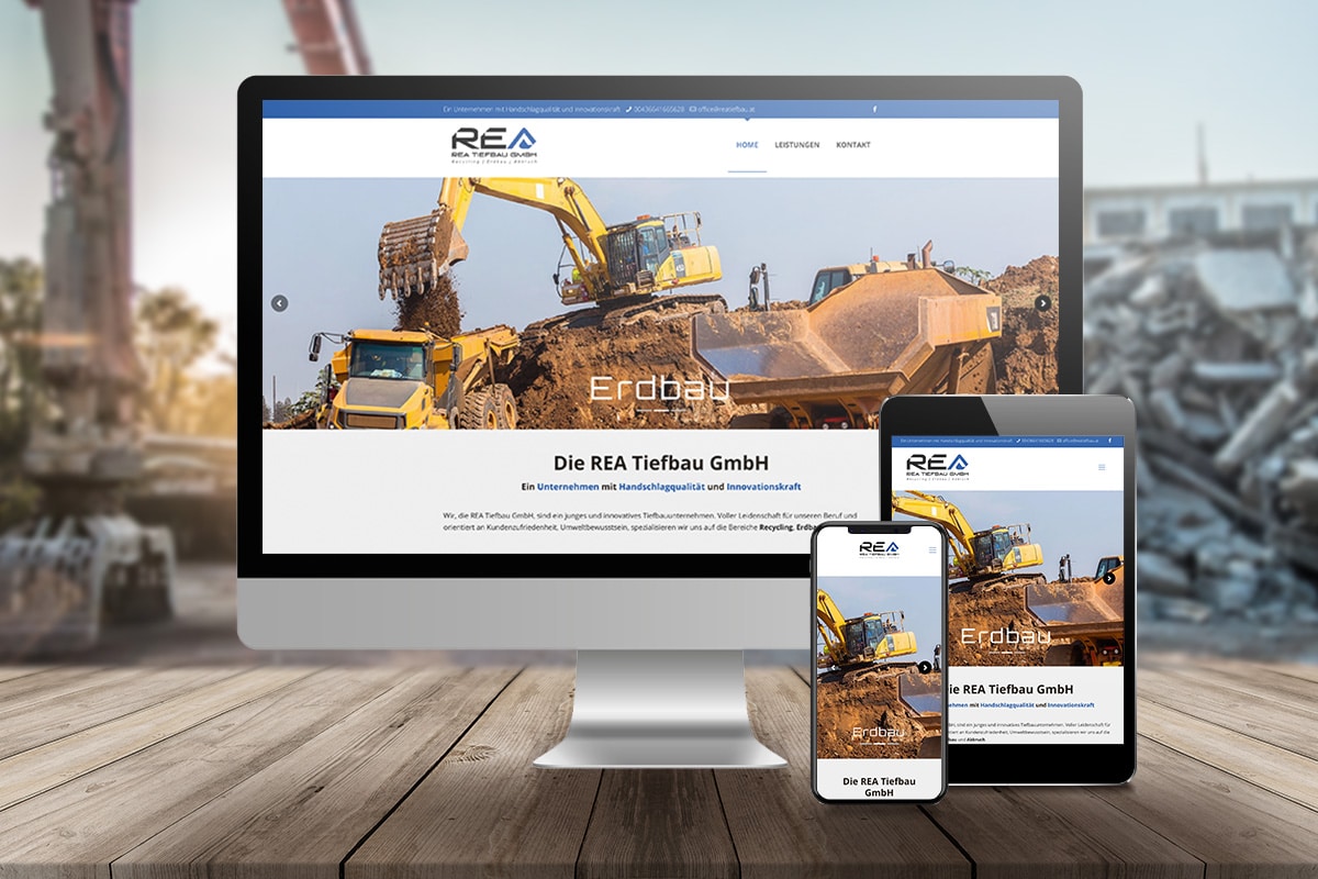 Da die REA Tiefbau GmbH ein neues Unternehmen ist, mussten wir auch eine neue Website hinsichtlich Farben, Aufbau und Inhalt gestalten. Es geht um harte Arbeit mit schweren Maschinen, also ist buntes Design und viel Schnickschnack fehl am Platz. Wir entschieden uns für eine einfache sowie benutzerfreundliche Aufmachung in den Farben blau und weiß. Die Website besteht, nach der Startseite, aus nur zwei weiteren Seiten. Die drei Leistungen Recycling, Erdbau und Abbruch, fassten wir unter einem Menüpunkt zusammen. Über ein integriertes Kontaktformular kann man seine Anfrage absenden und findet nochmals sämtliche Daten zum Unternehmen. Die neue Webseite ist dezente aber sehr informative Punktlandung für den Webauftritt der REA Tiefbau GmbH.